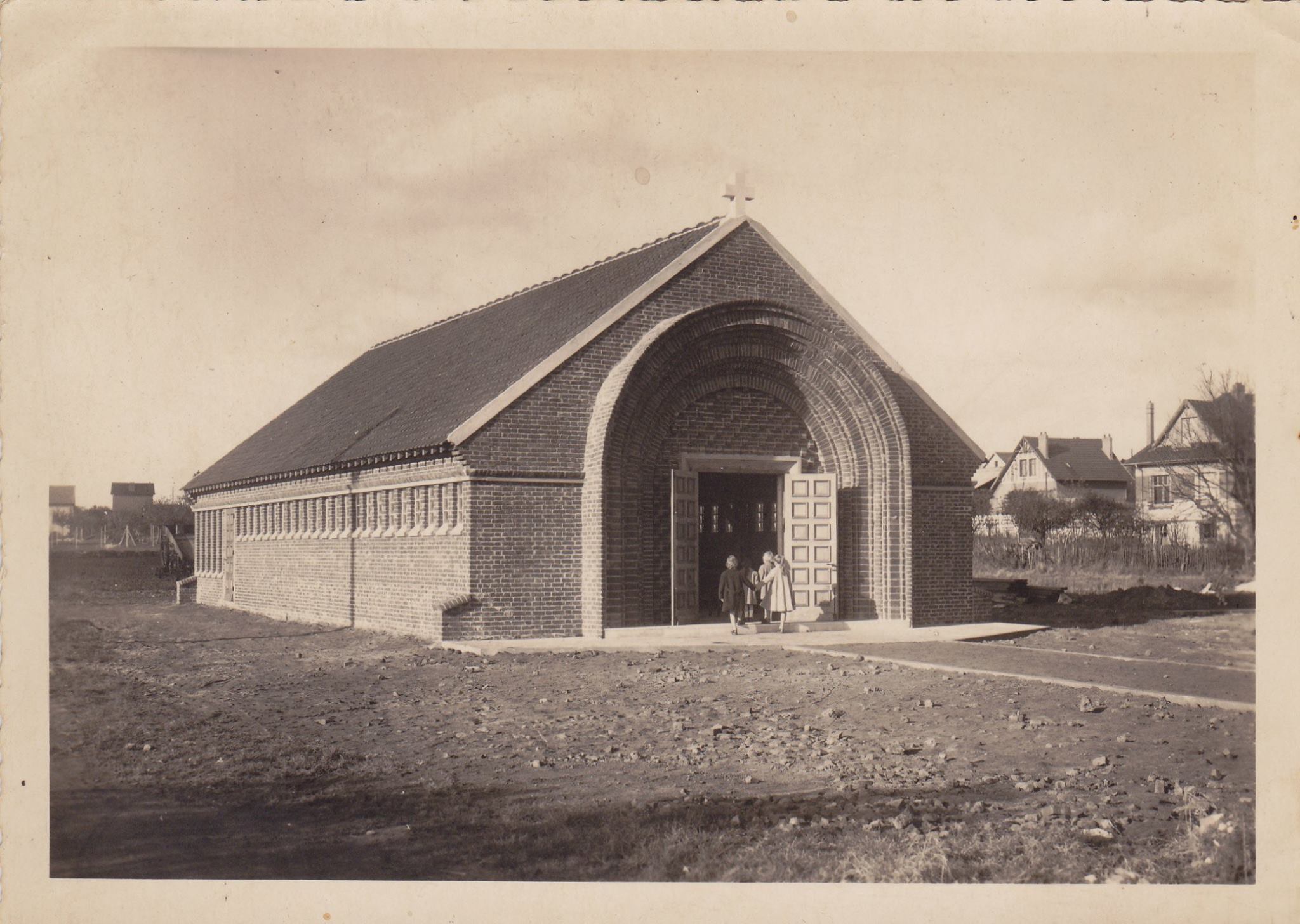 C’est en 1954 que prit fin la construction de cette chapelle baptisée « Chapelle Saint Pie X » en l’honneur, cette année là, de la canonisation du pape Pie X. C’est après leur travail à la briqueterie ou le dimanche que les ouvriers immigrés édifiaient au milieu d’un champ les briques lavées par les femmes pour construire cette chapelle. Toutes les briques, tuiles et ciment seront fournies par les familles de briquetiers Héral et Censier et la charpente serait une copie d’un modèle proposé par monsieur Censier.