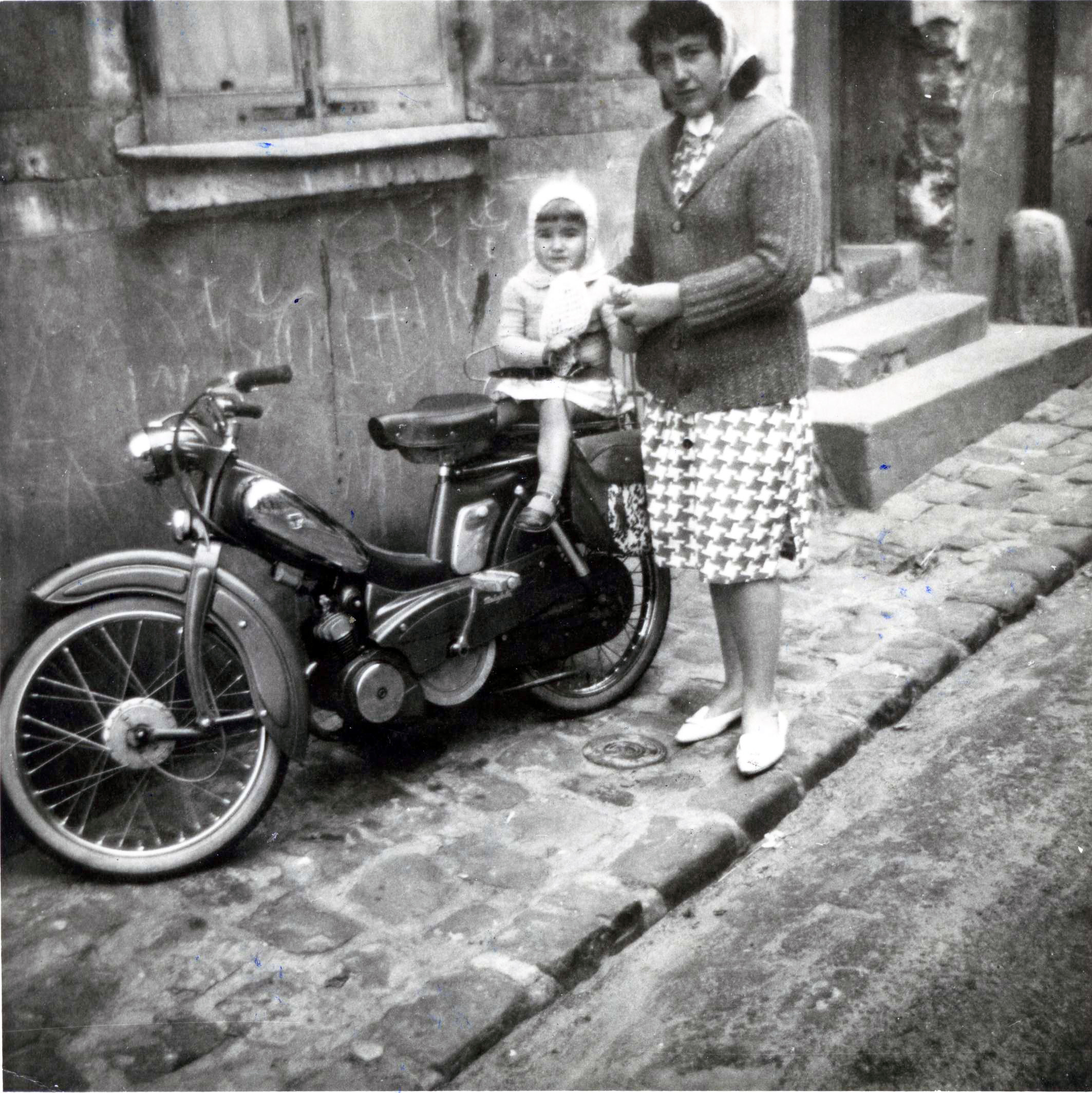 Voici la photo de la mobylette de chez Motobécane de ma mère. Cette photo a été prise en face du café épicerie Leclainche et anciennement Gastineau à Piscop. Sur la photo on voit ma sœur dans le panier et ma mère à côté. La photo a due être prise vers 1956. Cette mobylette avait été achetée chez Le Cloarec à Saint Brice sous forêt.