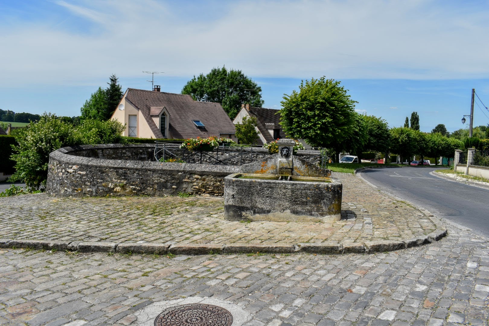 Lave-sabots et fontaine-abreuvoir, rue de la Vieille-France : Le lave-sabots ou pédiluve en pierre calcaire est l'un des rares exemples du type en hémicycle à subsister en Île-de-France. La fontaine-abreuvoir avec sa grande auge sculptée dans un bloc de pierre monolithe est marquée sur le cadastre de 1833 et semble être contemporaine du lave-sabots . Source : wikipedia crédit photos François vuillemet