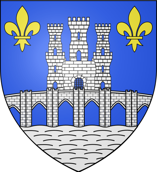 D'azur au pont de cinq arches d'argent, maçonné de sable, posé sur des ondes aussi d'argent mouvant de la pointe, sommé d'un château à la porte coulissée donjonné de trois tours du même, le tout ouvert et ajouré du champ, maçonné aussi de sable, accosté en chef de deux fleurs de lys d'or